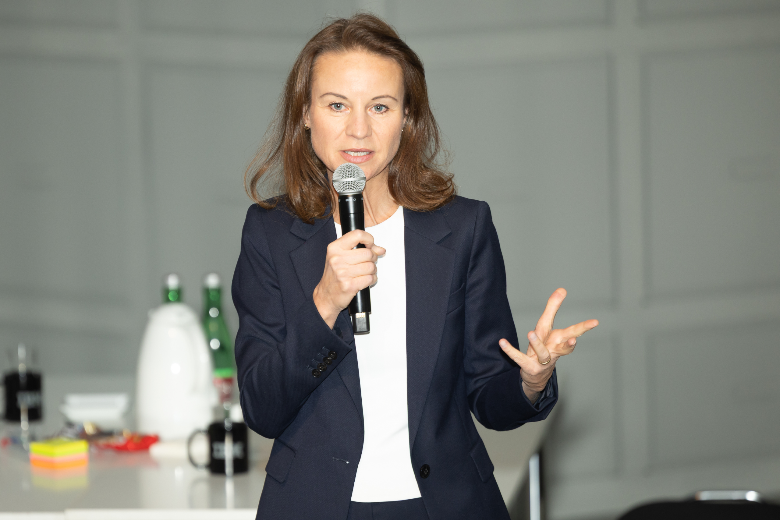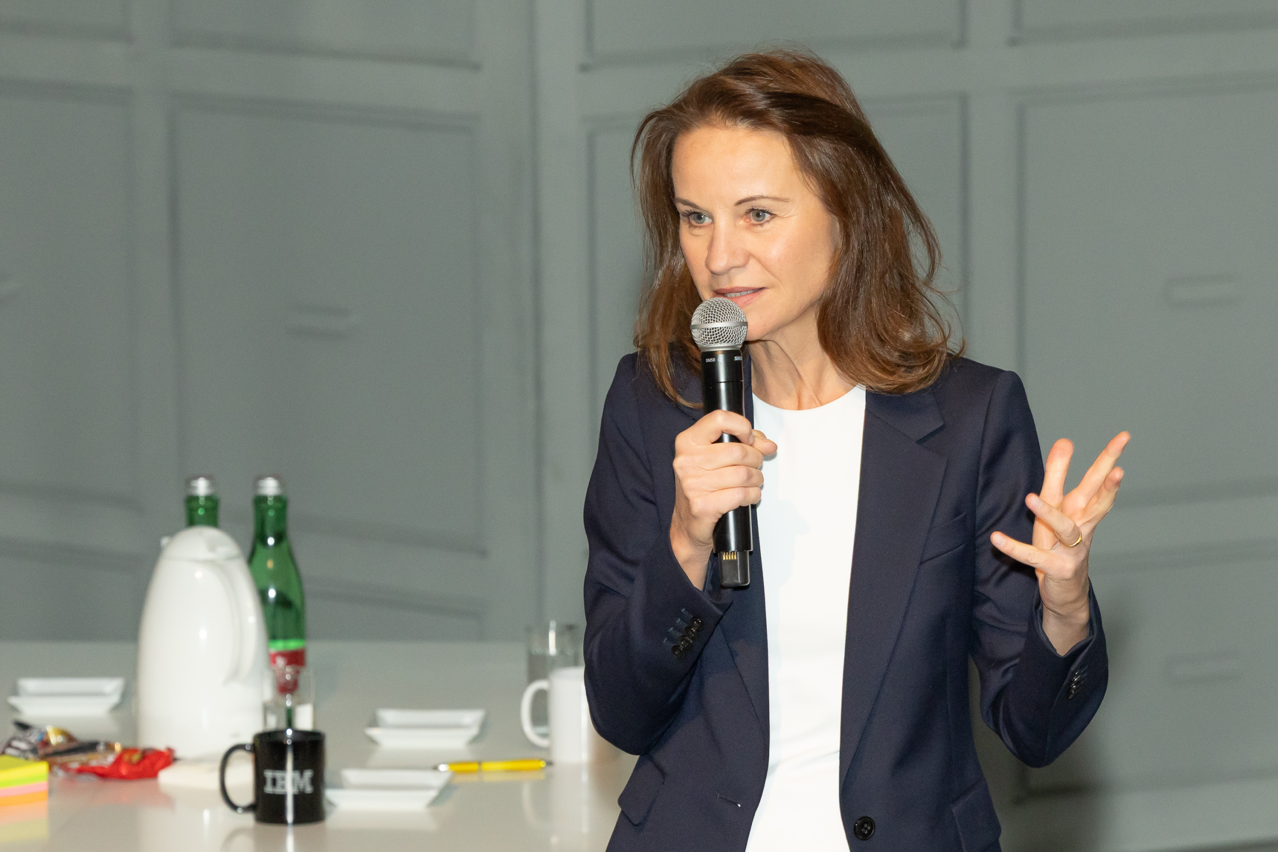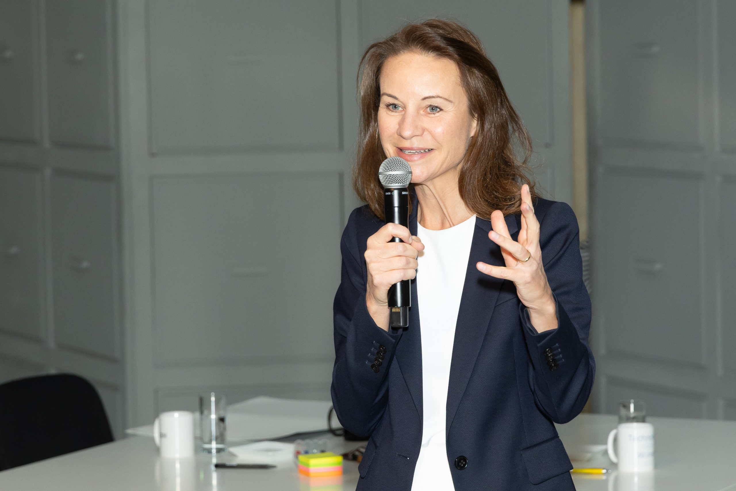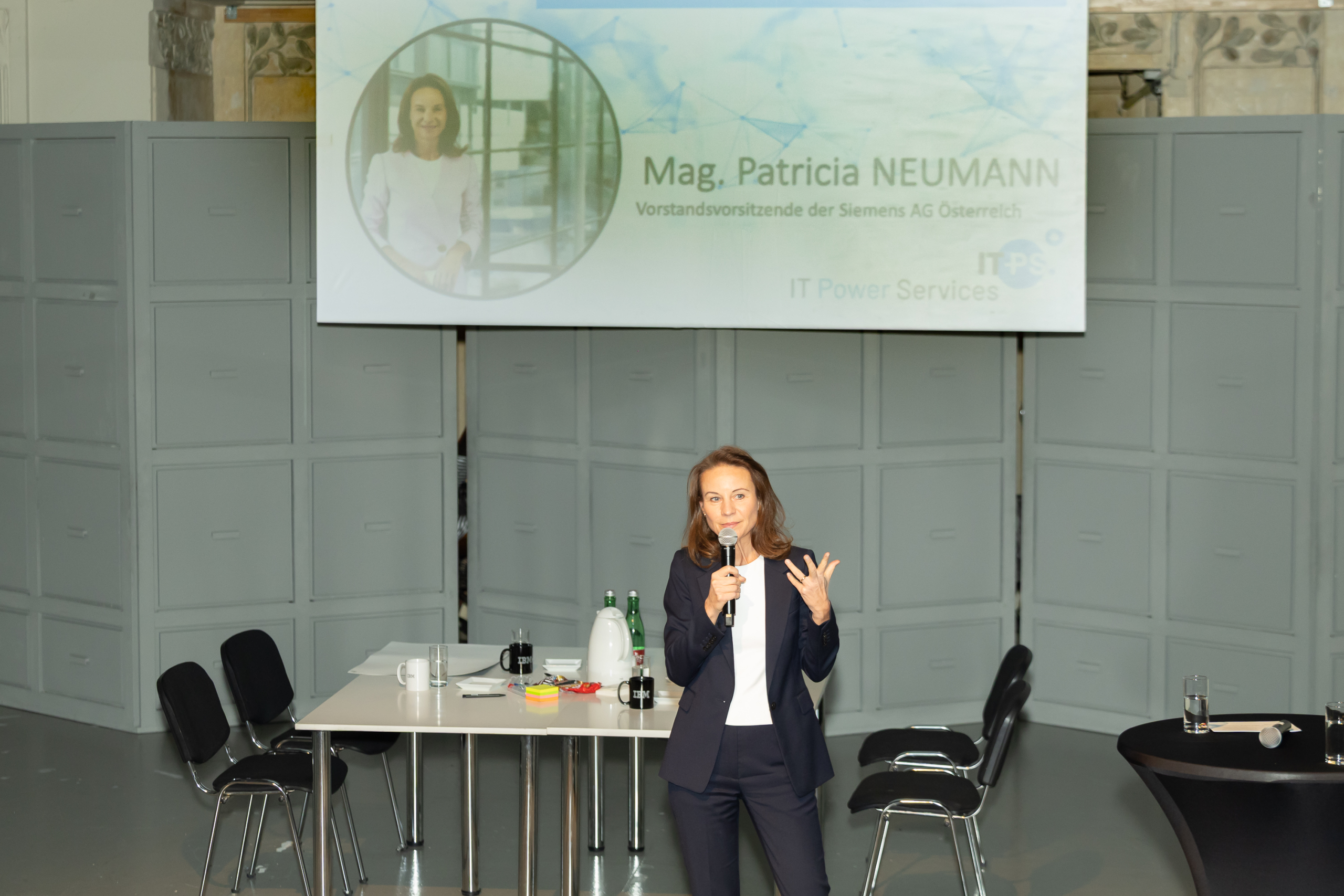 Man sieht Patricia Neumann, Vorstandsvorsitzende der Siemens Österreich, mit Mikrofon in der Hand, wie sie über Daten und Siemens spricht